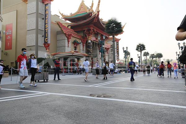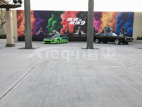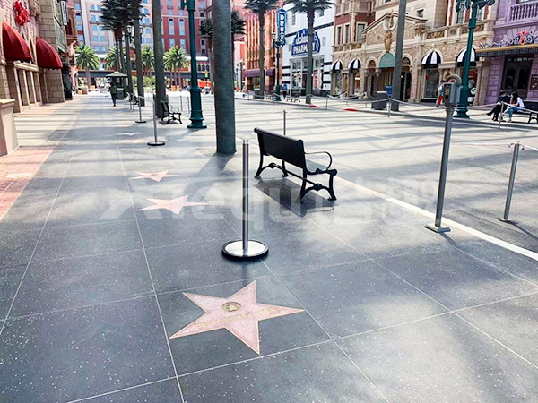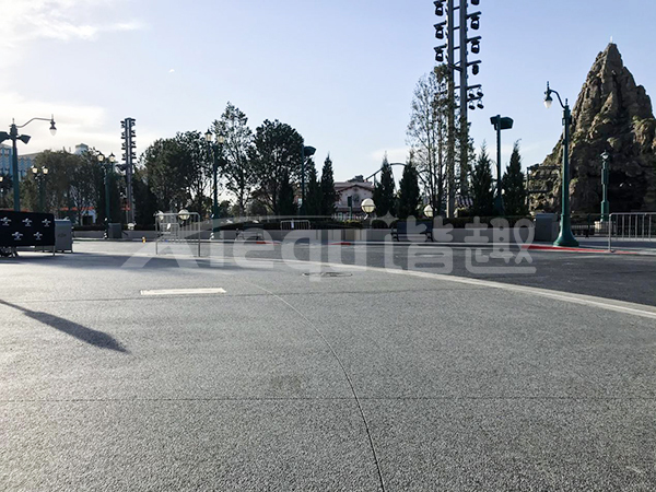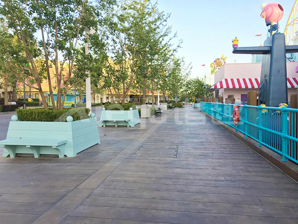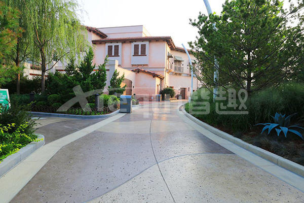 我司參與了北京環球影城好萊塢大道和小黃人兩個主題的路麵鋪裝工作,鋪裝麵積為2.4萬㎡。其中包含了彩色混凝土礫石麵藝術地坪、彩色混凝土壓印藝術地坪、彩色混凝土洗砂麵藝術地坪、彩色混凝土鹽岩麵藝術地坪、彩色混凝土仿泥仿塵藝術地坪、整體現澆路牙、掃毛麵、座椅牆、化學著色等鋪裝硬景。