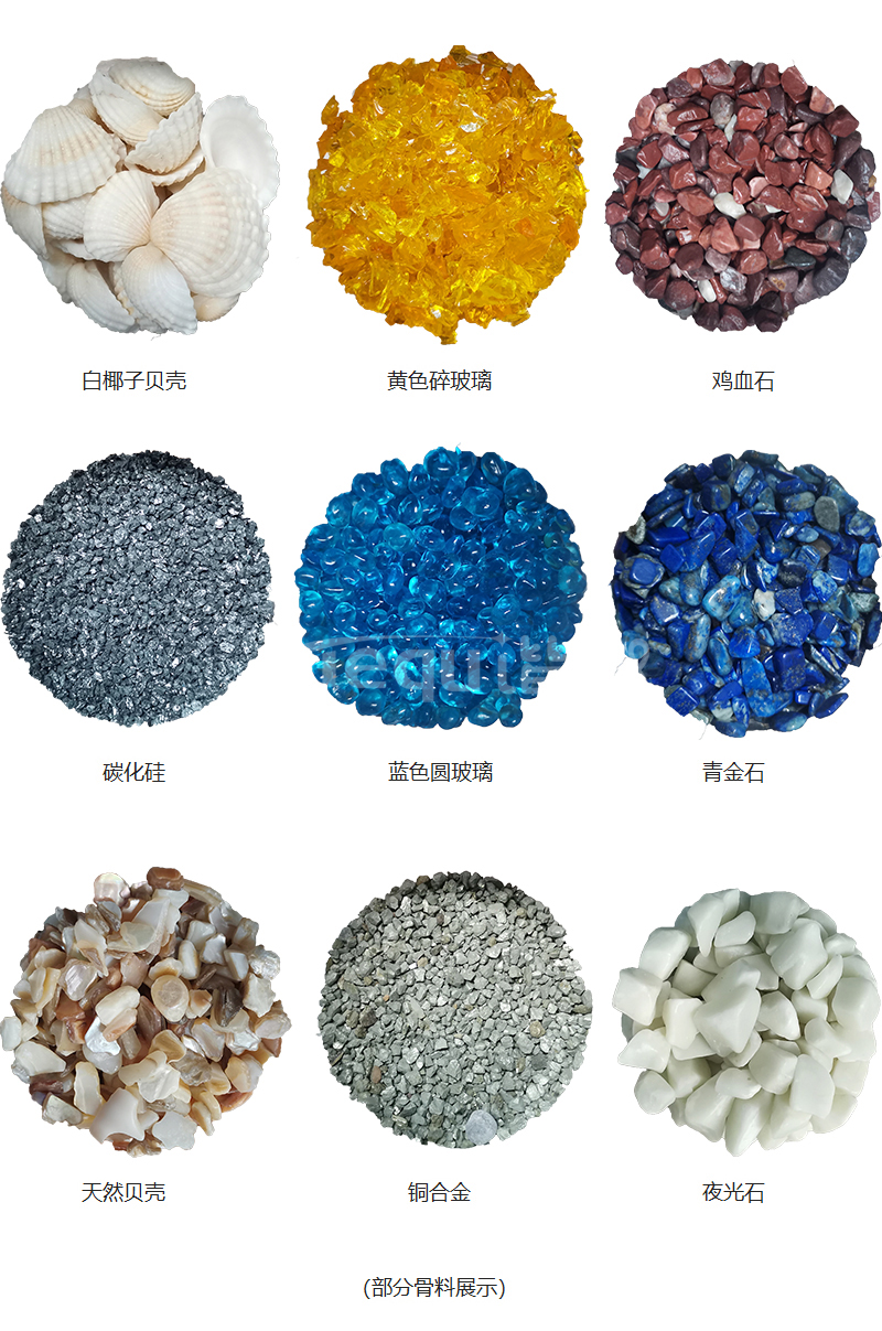 礫石聚合物藝術地坪所采用的骨料種類繁多,大體可分為金屬類、玻璃類、貝殼類、天然石料類。設計師可以根據不同的路麵風格選擇相應的骨料類型和色彩,使路麵富有藝術效果。