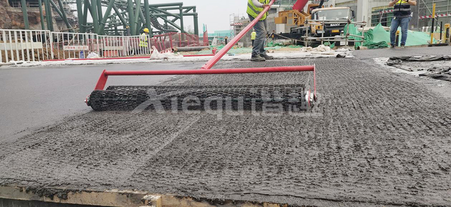 礫(li)石(shi)聚(ju)合(he)物(wu)藝(yi)術(shu)地(di)麵(mian)是(shi)在(zai)通(tong)體(ti)彩(cai)色(se)混(hun)凝(ning)土(tu)初(chu)凝(ning)前(qian)合(he)適(shi)的(de)時(shi)機(ji)按(an)照(zhao)一(yi)定(ding)的(de)比(bi)例(li)要(yao)求(qiu)將(jiang)特(te)殊(shu)骨(gu)料(liao)均(jun)勻(yun)的(de)拋(pao)灑(sa)於(yu)彩(cai)混(hun)麵(mian)層(ceng),再(zai)將(jiang)骨(gu)料(liao)拍(pai)入(ru)麵(mian)層(ceng)後(hou)進(jin)行(xing)收(shou)光(guang),最(zui)後(hou)在(zai)麵(mian)層(ceng)均(jun)勻(yun)噴(pen)灑(sa)鈍(dun)化(hua)劑(ji)薄(bo)膜(mo)覆(fu)蓋(gai),待(dai)混(hun)凝(ning)土(tu)固(gu)化(hua)到(dao)一(yi)定(ding)程(cheng)度(du)對(dui)表(biao)麵(mian)進(jin)行(xing)清(qing)洗(xi)露(lu)出(chu)骨(gu)料(liao)原(yuan)貌(mao)的(de)一(yi)種(zhong)裝(zhuang)飾(shi)做(zuo)法(fa)。
